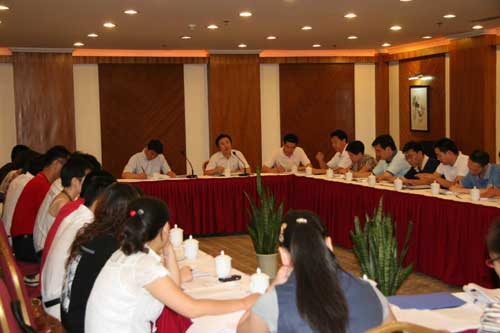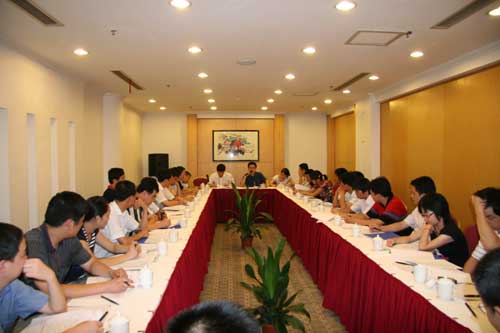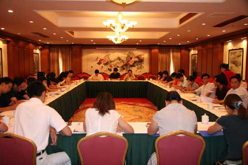 At 9:00 a.m., President Wang Liping as well as the board of directors sat down at round table. Presided by the vice general manager Dai Guoping, the meeting begins, and general manager Wang Junping makes the speech. He gives a detailed analysis on the aspects of business expanding, market management, production organizing and enterprise management, administration and logistic work, financial securities, etc, and puts forward specific blueprint of the later half of the year based on the exsisting weekness.