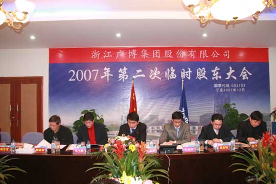 On the afternoon of December 18, 2007, Zhejiang Guangbo Group Co.,Ltd. held the second temporary shareholders’ conference in 2007 in Guangbo technology park as scheduled. The company’s presidents, supervisors, senior executives, the representatives of sponsor firms and witness lawyers attended this conference, which was hosted by President Wang Liping.