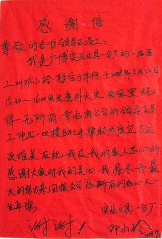 It was reported that the rare Sichuan earthquake destroied the house of Deng Xiaoling’s home. When she knew the loss of her family, she withdrew 3000 yuan from the bank and intend to send home, but disaster befall again. Her temporary dwelling in Ningbo was burnt down by the fire. The big fire relentlessly seized her total assets. Two sudden disasters brought heavy attack to her. She even wanted to end her life. After learned about Deng Xiaoling’s condition, the company gave her timely psychological guidance, and eliminated her extreme thoughts. From leaders of the company to her fellow workers, they all offered their warm hands, donated, and helped her family solve dwelling problem in Ningbo as well.