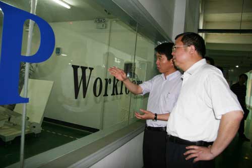 On June 23rd, Dong Shansheng, mayor of Shangrao city, Jiangxi province come to investigate Guangbo. President Wang Liping, General Manager Wang Junping as well as senior leaders of the company warmly received the group of people led by Mayor Dong, and accompanied them to visit nanometer production line, offset workshop, plastic making workshop, digital production line and the company’s sample exhibition center.