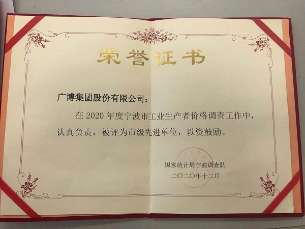 In 2020, Guangbo Group actively cooperated with Ningbo investigation team of the National Bureau of statistics to carry out the statistical investigation of industrial producer prices, and made a modest contribution to improving the quality of the city's statistical investigation of industrial producer prices. Therefore, Guangbo Group Stock Co., Ltd. won the title of "municipal advanced unit".