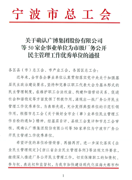 Recently, Guangbo Group Co., Ltd. was awarded the title of excellent unit for open and democratic management of factory affairs at the municipal level by the municipal federation of trade unions, which is the practical achievement of adhering to the employee congress system, promoting harmonious labor relations and promoting the common progress of enterprise trade union employees.