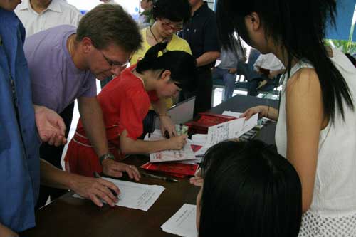 本来定好早上10点开始的助学活动,不到9点半很多人都赶来了,在广博工业园的礼堂里,很多人都在悬挂着的资料前认真选取。董事长王利平本来是定好出国的机票,为了参加这次活动,临时改了航班,带着香港分公司的经理,一起来认助了50多名学生;一位长期与广博合作的美国客户,听到这个活动,硬拉着总经理王君平,在业务员的翻译下,认真选了十来个学生;一位部门经理从外面办事回来,看到最后只剩下10名学生,看都没看就全包了;从党员干部,到普通员工,从博士总经理,到技术骨干,广博的员工们都在认真认助;从车间赶来的几名员工,在外地出差电话打来预定的,略带遗憾的员工都表示,他们还将会通过其它途径去认助这些学生的。