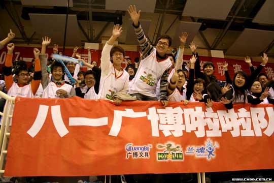八一队,加油!”12月8日晚上,在杭州树人大学体育馆,响彻全场的加油声居然是给客队的。原来,广博集团为了让球队在客场发挥得更好,专门组织了560多球迷前往现场为八一广博呐喊助威,其中包括还 “专业”的宁波兰魂拉拉队。 杭州的女篮球市并不好,这500多名客队拉拉队居然比来为主队加油的球迷还多。在8日的比赛中,每当八一广博进攻的时候,现场就有敲击充气棒发出的巨大声音。而当八一广博防守的时候,赛场里 “防守,防守”的声音又会响击。当在浙江队罚球的时,赛场里听到的是一片的嘘声,使得浙江队的罚球率很低。让人不由得怀疑这里是不是八一广博的主场。 其实,这是广博集团组织的五六百人的助威团在现场为八一广博女篮助威。尽管赛场里观众不少,但看球时很安静,手里也没有 “武器”。或许是被广博助威团感染,这些人在现场DJ的带领下开始为浙江队助威。不过,他们还是无法压过穿有统一服装,清一色充气棒 “武装”起来的广博助威团。 于是,比赛中出现了这样有趣的一幕:每当主队队员罚球时,场上的干扰声就震耳欲聋。杭州赛场的DJ最后实在忍受不了,拼命地煽动主场球迷喊“加油”,但只要他们的加油声一结束,为八一广博加油的声音就整齐地反击回来,DJ最后没办法,在客队球迷加油时将现场音响的音量放大,以此压制客场球迷。比赛快结束时,兰魂球迷更是高唱“我们赢了”。 比赛结束,八一广博的姑娘们专门到客队球迷面前挥手致意,感谢球迷们的呐喊助威。