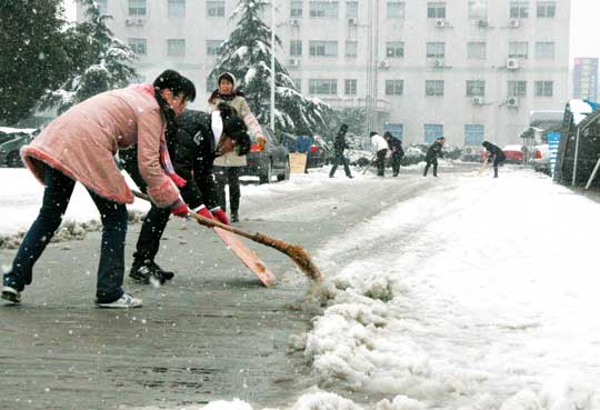 这两天,大雪纷纷扬扬下个不停,就像给甬城辅了一层厚厚的棉絮。广博工业园区的地面、建筑以及树木全是银装素裹,加之头天夜里已下了一整夜,地上的积雪已有五厘米厚。为保持正常的生产、生活秩序,2日上午刚上班,公司领导便组织各部门员工到厂区清扫积雪。