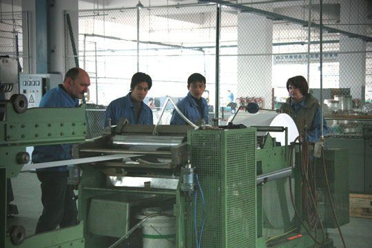 技术专员代表Frits Gösgens一行一到公司,就换上工作服来到车间,对新引进的生产设备的安装和运行做了详细检查,并一一指导和培训技术人员,他们一边通过翻译讲解,一边通过手势等形式,详细介绍了设备的性能、运行方式和生产效能等,经过几天下来,这5位技术专员已成为这个车间很多员工的好朋友,他们之间已配合得相当默契、和谐、自然。