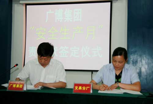 随后,广博集团领导与各分厂、分公司负责人《生产安全责任书》,要求各分厂、分公司负责人作为安全生产的第一责任人,必须确保广大一线员工的生命财产安全,加强车间一线员工的安全生产培训,提高车间一线员工的安全防范意识,从源头减少安全事故的发生。