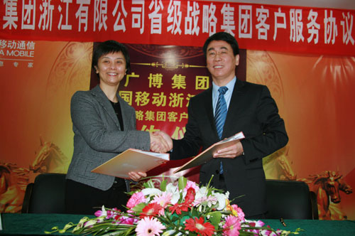 中国移动浙江公司从全省主要的骨干企业中选出22家大型重要集团,由省移动公司协助各地分公司,共同开展战略集团服务工作。广博集团是中国文具行业的龙头企业,以省市移动公司两级联动的方式开展服务,目的在于提升双方之间的交流层次、拓宽沟通渠道、扩大合作领域,通过签订协议、高层互访和各层次交流,实现感情、业务和利益上的融合和提升。服务协议规定,中国移动浙江公司在业务范围及经营区域为我公司提供“优质、优先、优惠”的移动通讯服务。