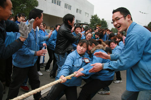 决赛环节一开始,实业一分厂代表队先发制人,标杆向前挪动了近一寸,关键时刻,纸制品五厂代表队顶住了压力,她们咬着牙,卯着劲,分厂厂长和车间主任为首的啦啦队卖力的加油声就像是强有力的号子把队员们的力量拧成了一股绳,硬是没让绳索再前移分毫,慢慢地,他们竟然占据了主动,并在长达5分钟的僵持后赢得了比赛,赛场上一片欢腾……