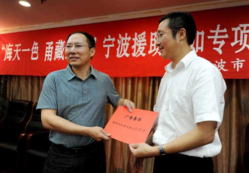 8月5日上午,宁波市慈善总会和宁波晚报社联合举行“海天一色 甬藏连心”宁波援助比如专项发展资金捐赠仪式,广博集团、宁波市教学仪器设备行业管理协会、天鸿建设集团三家单位分别向比如县捐赠钱物总计40余万元。