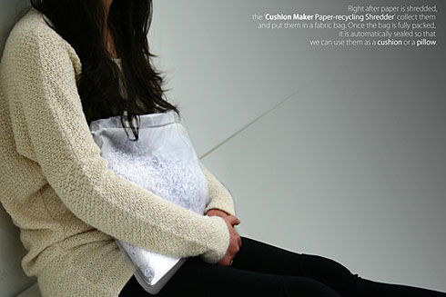 许多现代化的办公室都装备有碎纸机——好吧,的确很方便,但是那些被销毁的纸张,除了被扔进垃圾堆,就没有别的什么更好归宿了么?设计师Gyeongwan Koo显然并不这么看,他认为,这些纸屑完全可以变成抱枕: