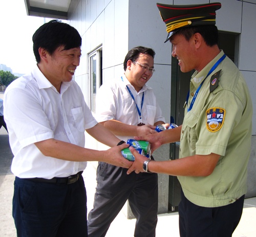 下午2点多许,舒耀平一行来到生产车间,给职工代表分发饮料,并转达董事长对他们的诚挚问候,叮嘱有关负责同志,一定要安排好职工的轮休,保证职工休息好,确定不发生中暑。在保卫科大门执勤岗慰问时,舒耀平与执勤经警握手,感谢他们在高温下仍然坚守岗位,保卫集团安全,反复叮嘱他们要注意身体,做好防暑降温。