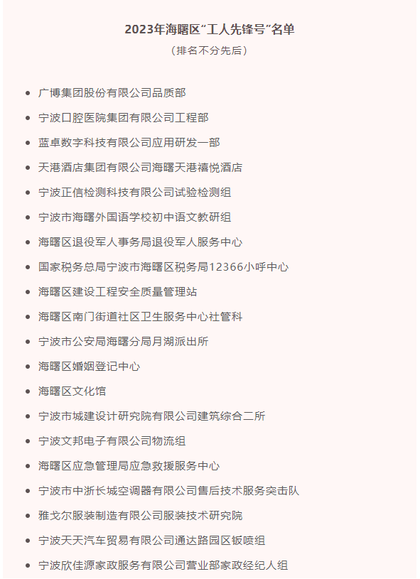 4月25日,海曙区“曙光成炬 匠心筑梦”庆祝“五一”国际劳动节暨劳模先进表彰大会举行。广博集团股份有限公司品质部荣获2023年海曙区“工人先锋号”先进集体。