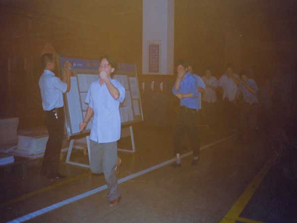 下午14点05分,随着演习开始口令的下达,演习工作人员拉燃了烟雾弹,胶印车间内立即冒出了滚滚浓烟,车间内顿时响起了急促的报警铃声。14点08分,动力科工作人员听到警报铃声迅速切断车间内的电源,及时打开了消防通道。14点10分消防队立即进入紧急状态,分成两组进入“火灾”现场进行灭火。当消防队进入现场时,胶印车间里早已是浓烟滚滚,能见度几乎为零。第一组队员在进入车间后,马上开始疏散车间被困人员,在他们帮助下,车间员工虽然紧张,但都有序地跑向安全出口。与此同时,第二组队员也在紧张的进行着“灭火”工作,他们一进火场就迅速抱起消防水袋,以百米冲刺的速度跑到消防水龙头,并准确地接好接口,进行地毯式的灭火。14点25分车间里所有员工被安全的疏散到门口集合,“重见天日”的员工们显得即紧张又兴奋。
