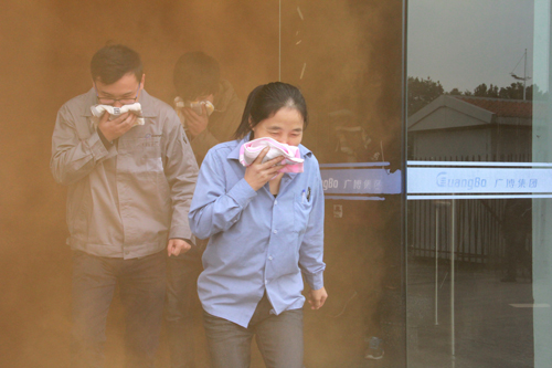 On the afternoon of November 9,a thick yellow smoke suddenly came out from the door of Guangbo stock company’s accessories workshop. Then dozens of workers gradually ran out from the thick smoke. They were all crouched, covering the nose and mouth with towels. After running out, they gathered on the open ground in front of the workshop to communicate with the feeling of the "escape" out of the workshop. Turned out to be Guangbo Group’s annual fire safety skills mimic exercise.