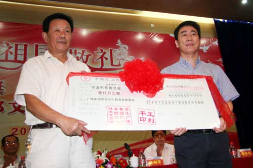 9月21号下午,浙江广博集团向宁波慈善总会,捐款1000万元西部文化教育慈善基金,定期向西藏、内蒙古、甘肃、四川地区捐献助学基金,表达集团公司对西部教育事业的关注和对西部地区发展的支持。同时,举行“迎国庆·歌唱祖国”歌咏大赛,以这种特殊方式向新中国60华诞献礼。